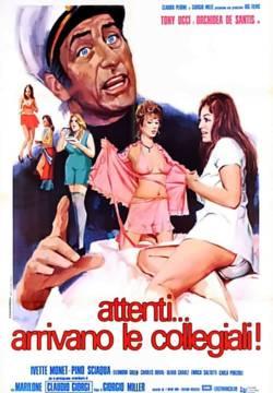 Attenti... arrivano le collegiali! streaming cb01... Marina studia a Roma, in un collegio privato. Suo padre, che tutti chiamano "il Comandante", possiede a Torvaianica un albergo ed è lì che Marina si reca per trascorrere un fine settimana di tutto relax con le amiche Sandra, Betty, Giovannona, Yvette e Patrizia. Le accompagna Nadia, l'istitutrice tedesca che appare assai rigida e contenuta ma che presto si rivelerà focosa e disinibita tra le braccia del Comandante. Intanto la presenza delle collegiali attirerà come mosconi Alberto, fratello di Marina, e i suoi amici vitelloni.